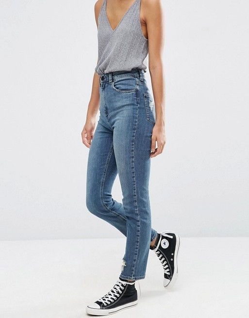 FARLEIGH High Waist Slim Mom Jeans In Bebe Dark Stonewash Blue With Rips